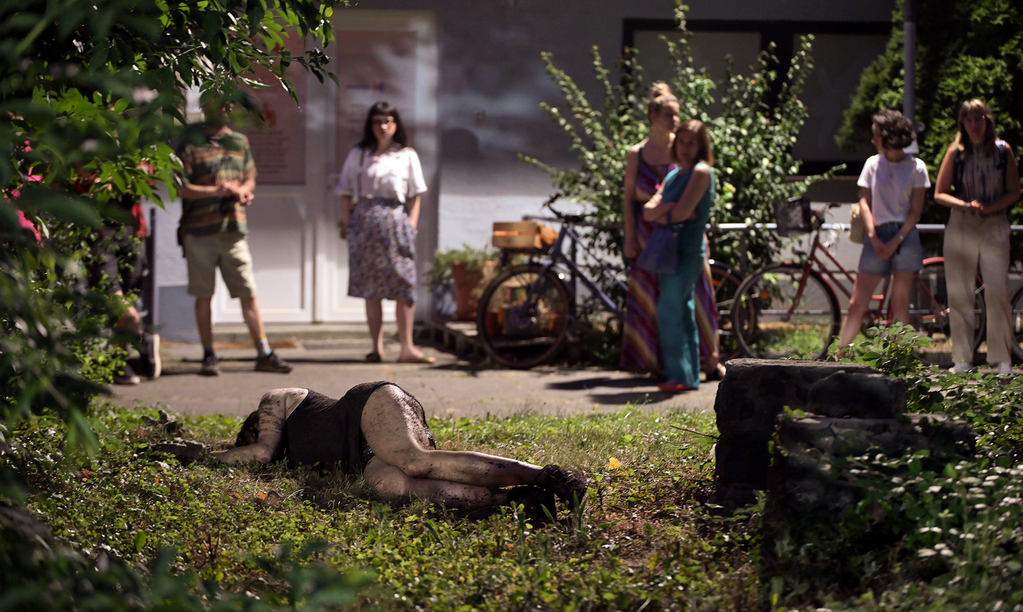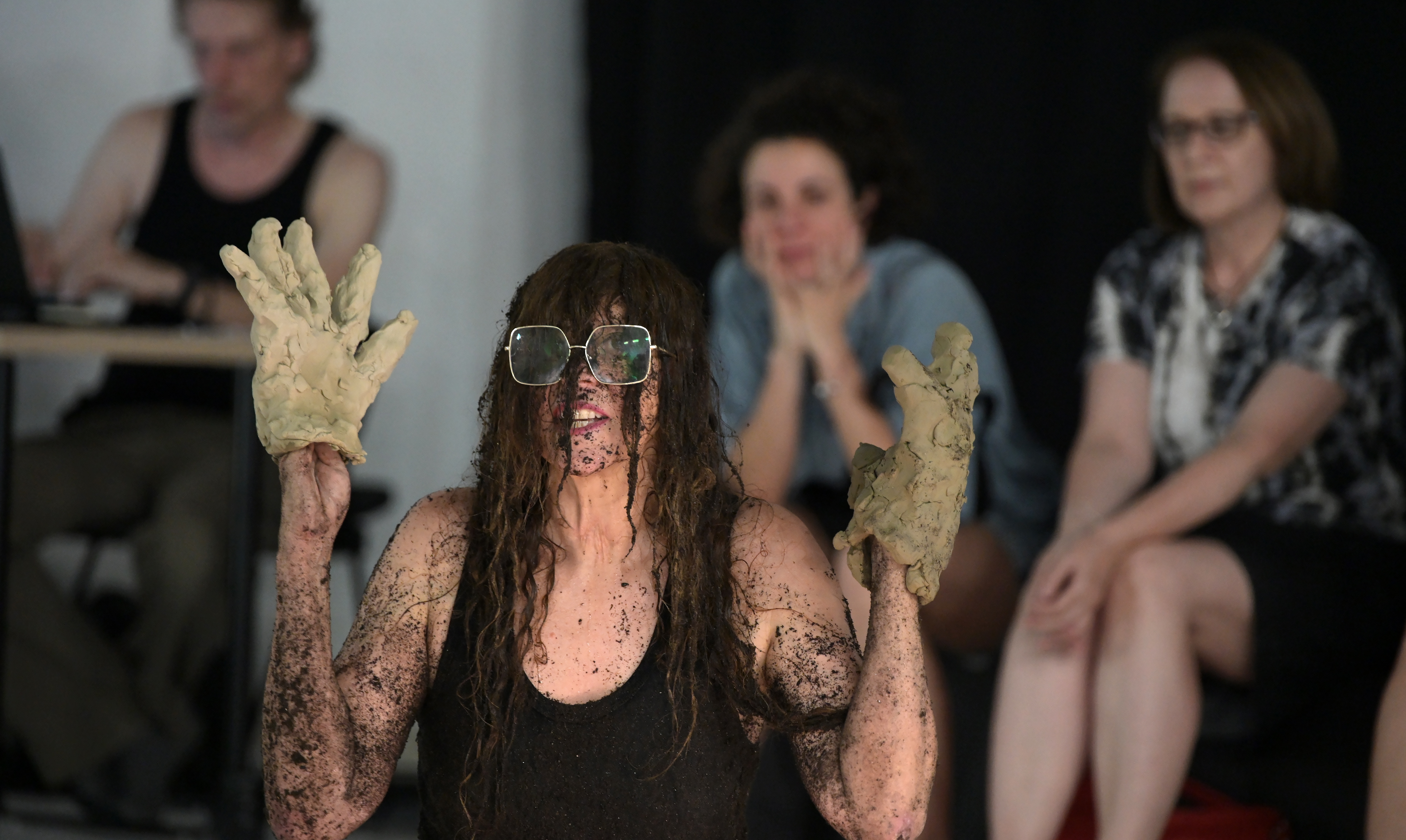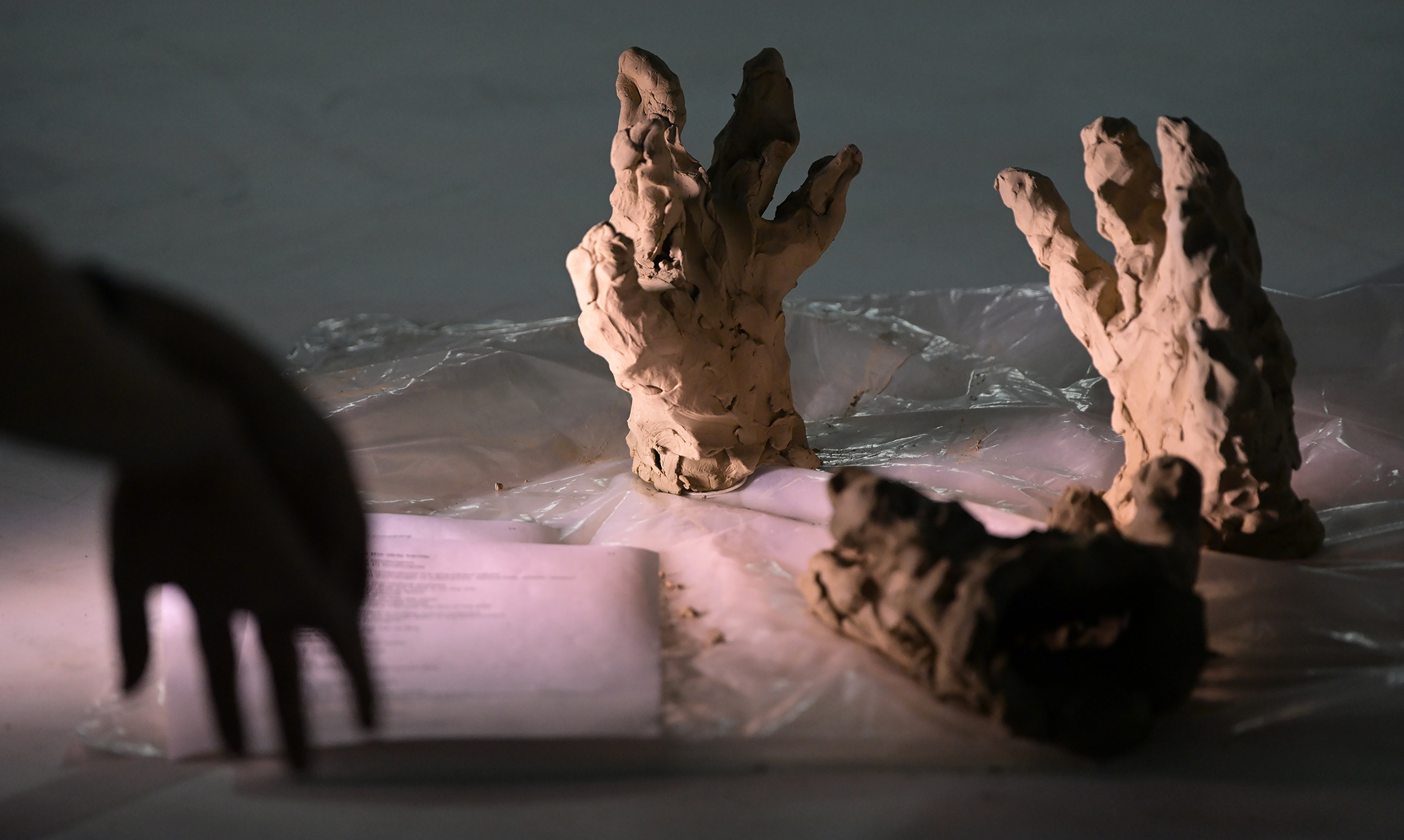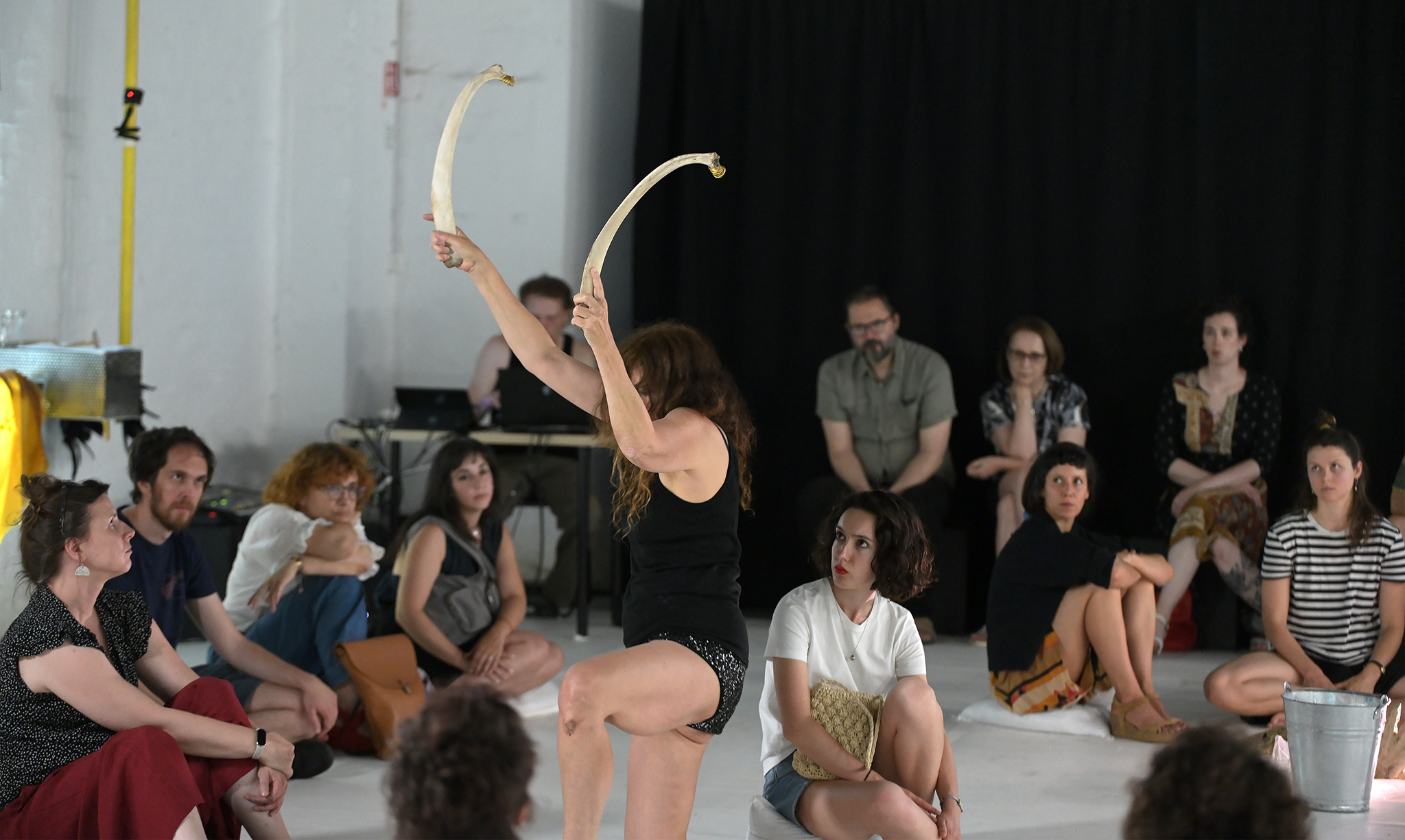 ist ein performatives poem in einem geteilten raum, welches sich zu jeder aufführung und mit jedem raum refiguriert und weiterentwickelt. claudia bosse lässt eine taktile, performative landschaft zwischen den besucherinnen entstehen und verbindet dabei auf sinnliche weise materialen wie latex häuten, knochen, federn, ton, salz, erde, metall, stoff und stein. die performance kombiniert textfragmente mit bewegungen, relationen und sounds und öffnet kollektive spekulationen über verhältnisse zur belebten umgebung und dem planetarischen garten erde.